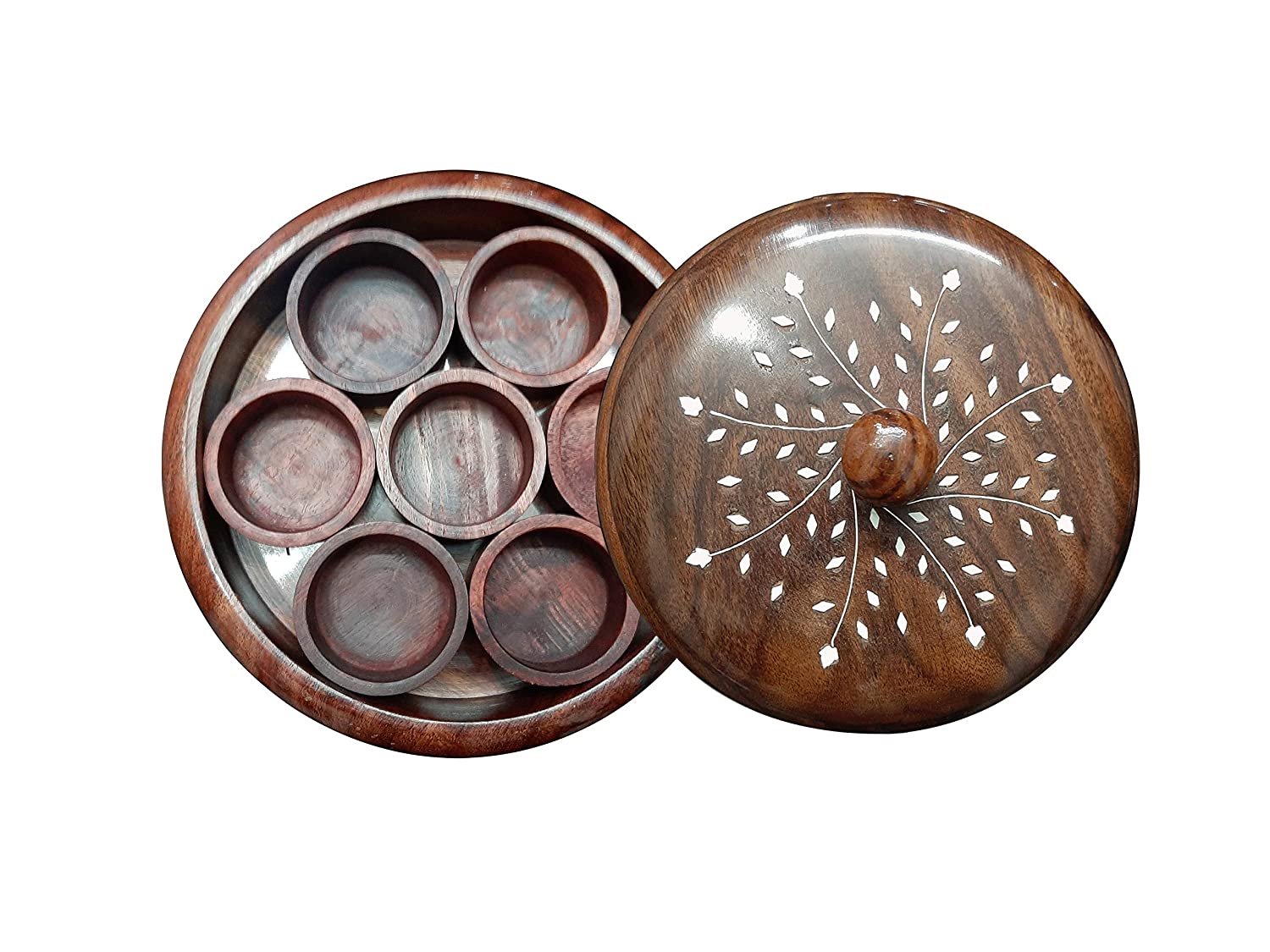 Round Sheesham Wooden Masala Box / Spice Box and Spoon